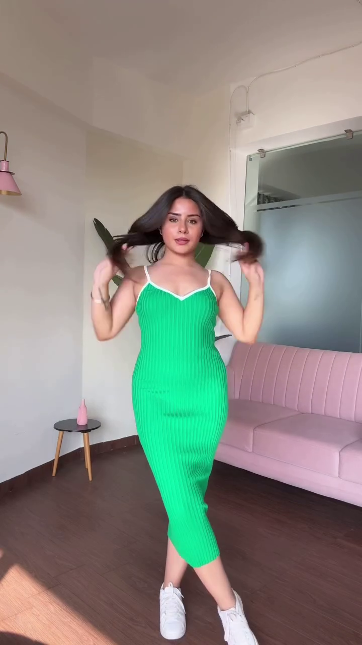 In the image, the model’s styling enhances the dress’s charm. Long, dark hair flows naturally, adding depth and contrast to the pastel tones. A gentle smile and relaxed pose suggest comfort and confidence, while the raised hand adds a touch of spontaneity and movement. The white sneakers ground the look in casual cool, making the outfit perfect for everyday wear, boutique browsing, or curated catalog moments.
