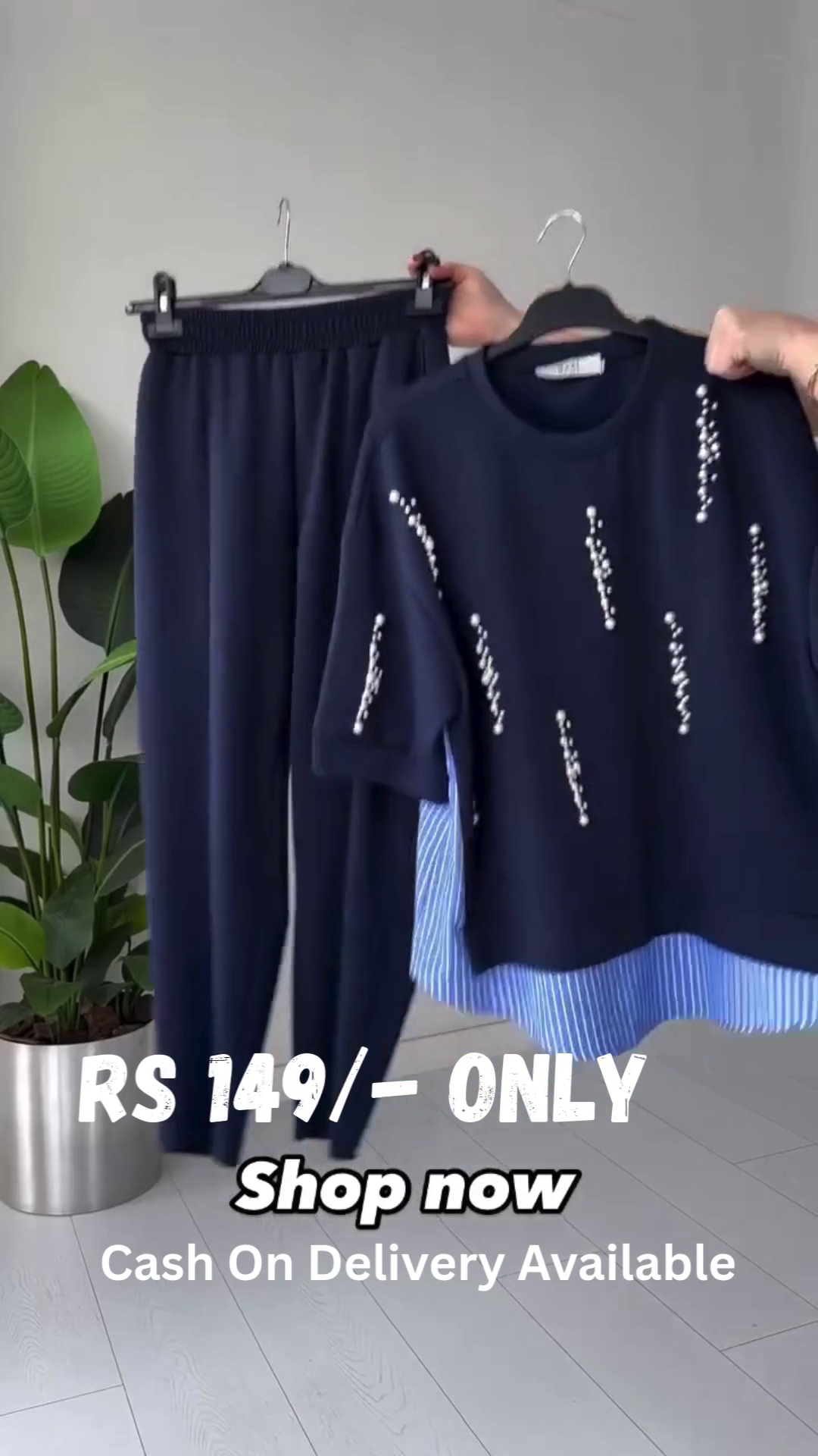 • Navy blue top with pearl embellishments for a touch of elegance