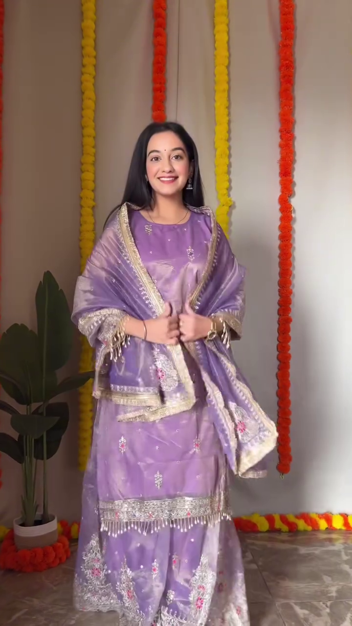 The backdrop of the image—a wall adorned with vertical garlands in shades of orange, yellow, and red—enhances the festive mood. These colors, symbolic of joy and prosperity, contrast beautifully with the soft lavender of the outfit, creating a visual harmony that’s both striking and soothing. A potted plant with broad green leaves adds a touch of nature, grounding the scene in organic beauty and suggesting a connection to earth and tradition.