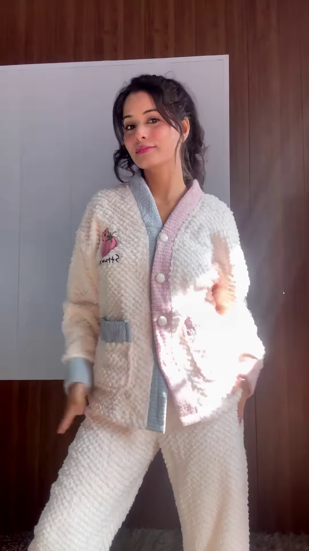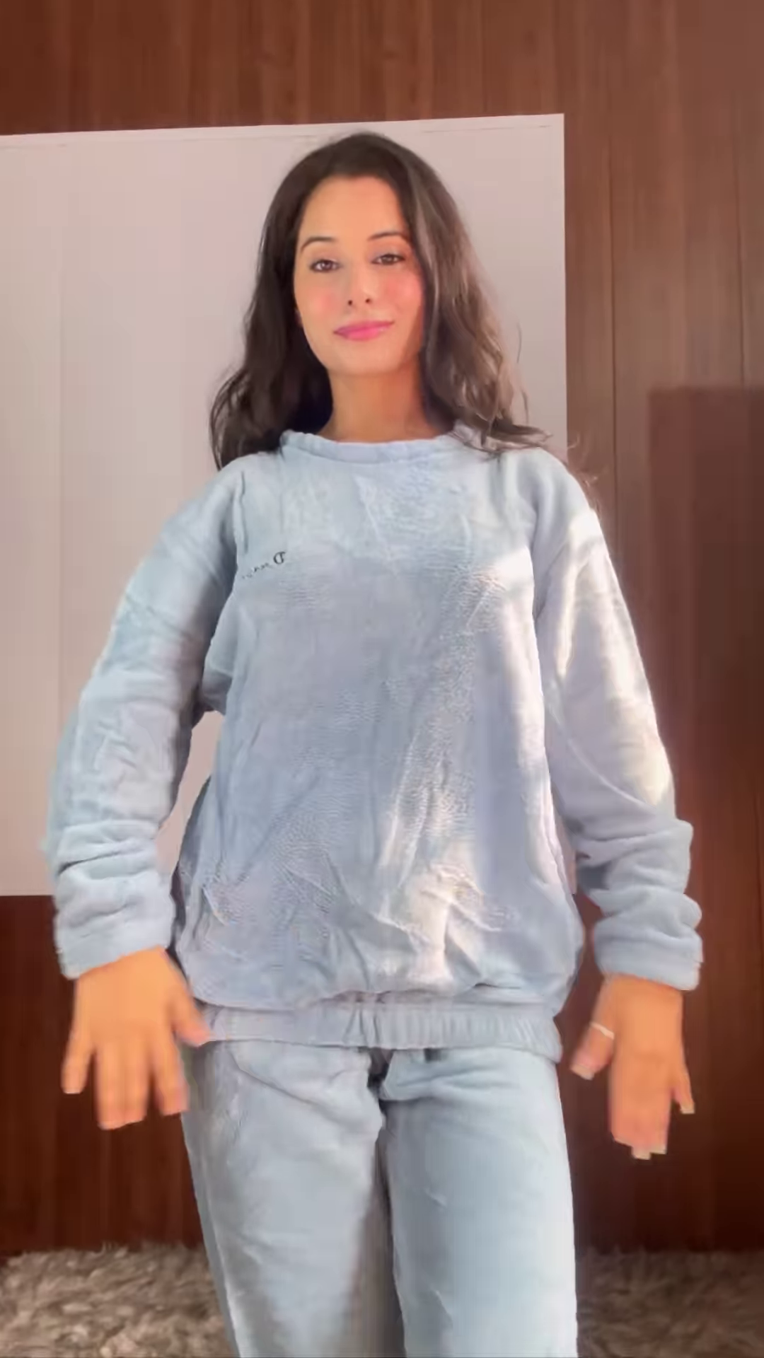 • 🔹 Light Blue Plush: Full-sleeve sweatshirt and matching pants in soft blue fleece + styled on fluffy rug