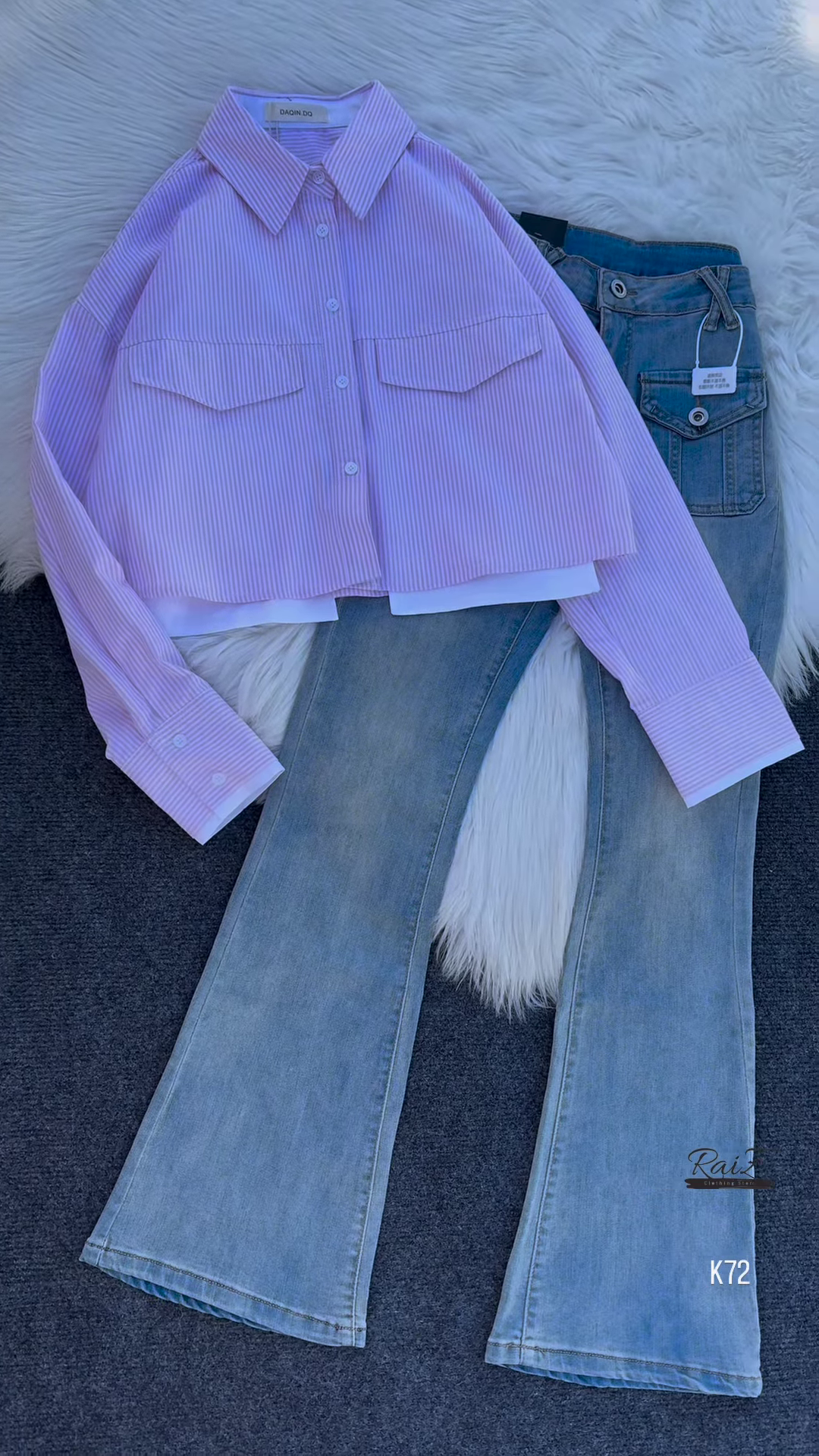 • Pink Striped Shirt with Flared Denim Jeans