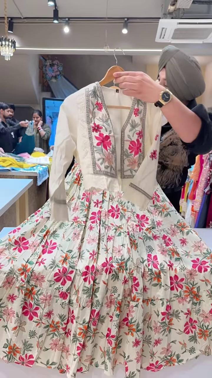 + Free ShippingMake a bold festive statement with this cream-colored Anarkali-style dress featuring multicolor floral embroidery and a voluminous flared hem. Crafted for ethnic fusion edits, boutique catalog features, or celebratory carousel drops, the ensemble blends traditional craftsmanship with striking color play and structured elegance.