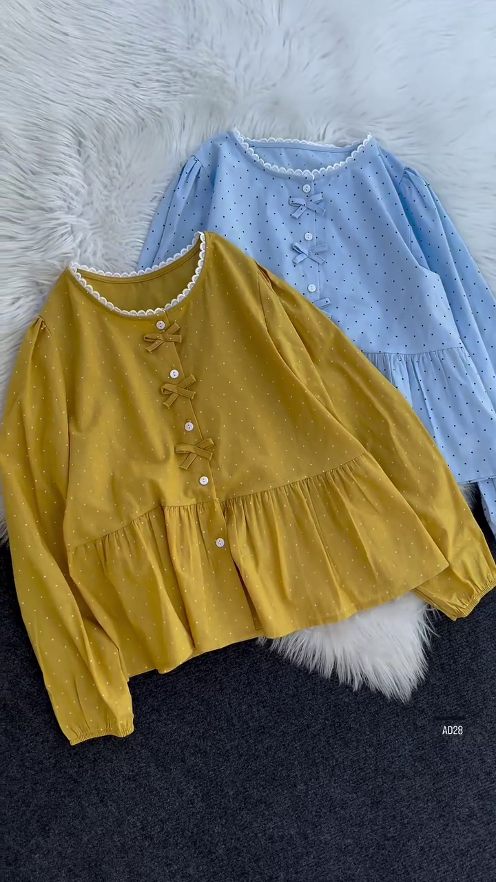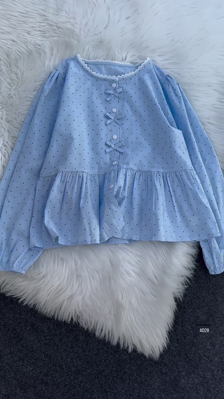 Crafted from a soft, breathable fabric, the blouse features a subtle polka dot pattern that adds a lively, youthful vibe without overwhelming the design. The round neckline is delicately finished with lace-trim piping, offering a hint of vintage-inspired charm. Centered on the bodice, dainty bow accents enhance the overall look with a sweet, decorative detail that highlights femininity.