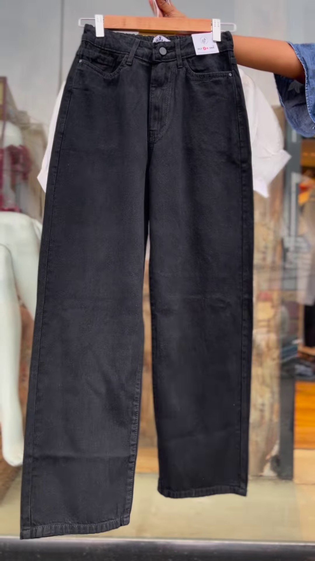 The handheld hanger presentation backed by glass-panel storefront visuals introduces retail realism and merchandising clarity. This setup works well for influencer haul content, online flat lays, or boutique thumbnails where coordinated layering drives scroll-worthy impact.